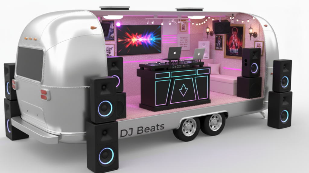 For DJs building a personal brand, a mobile DJ studio trailer allows you to arrive at gigs, parties, and events with a complete, self-contained setup. External speaker systems can be wired directly to the internal sound station, creating a high-output mobile DJ booth that’s ideal for outdoor events, festivals, and large private functions. The trailer itself becomes part of the show — a focal point that draws attention and sets the stage.